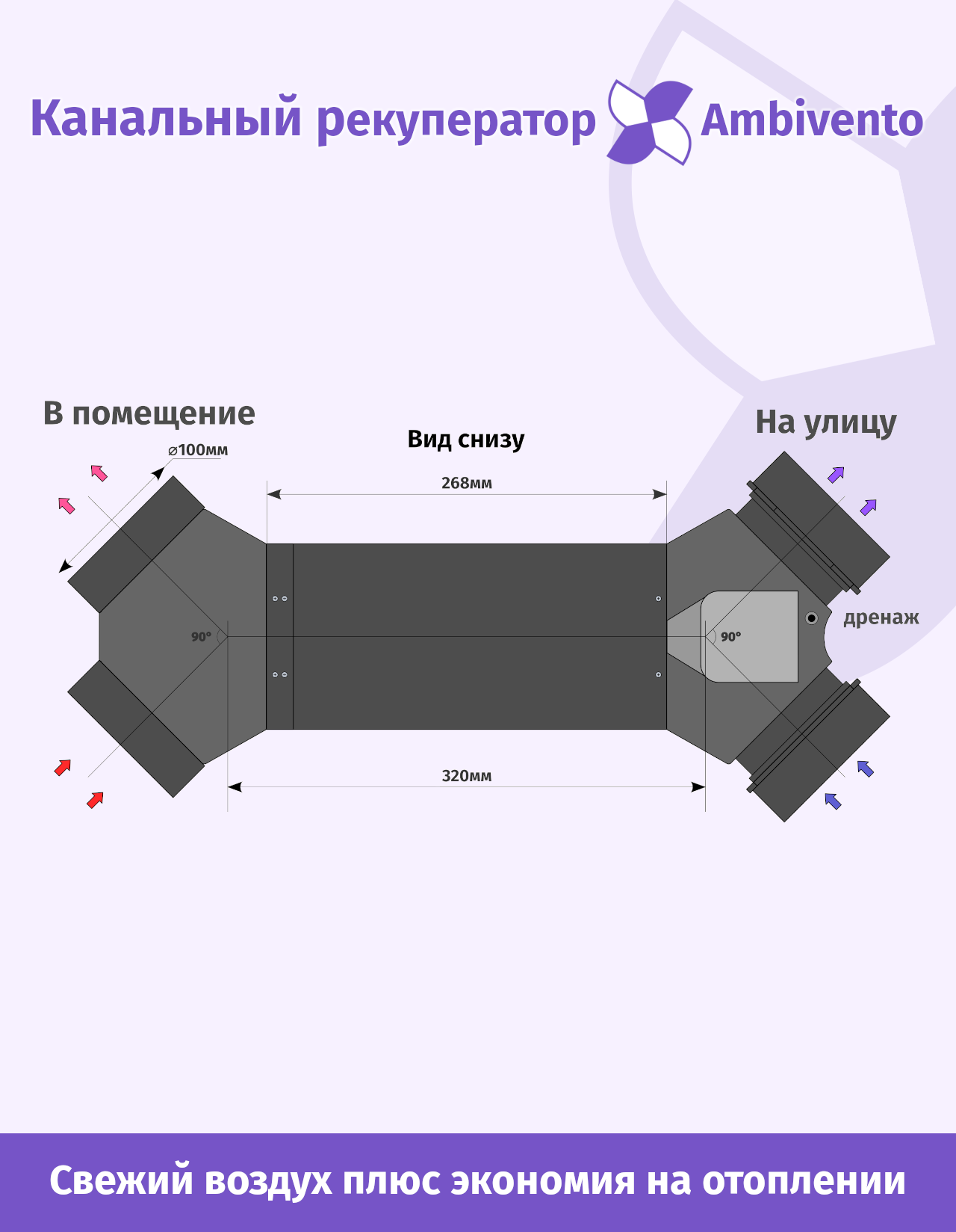 Модель рекуператора Ambivento для использования со стандартными вентиляционными каналами 100мм. Обладая всеми достоинствами моделей, монтируемых внутрь стены, как то высокий КПД и низкий уровень шума, данная модель может быть установлена в произвольном месте, а разводка подачи воздуха производится с использованием стандартных вентиляционных каналов.