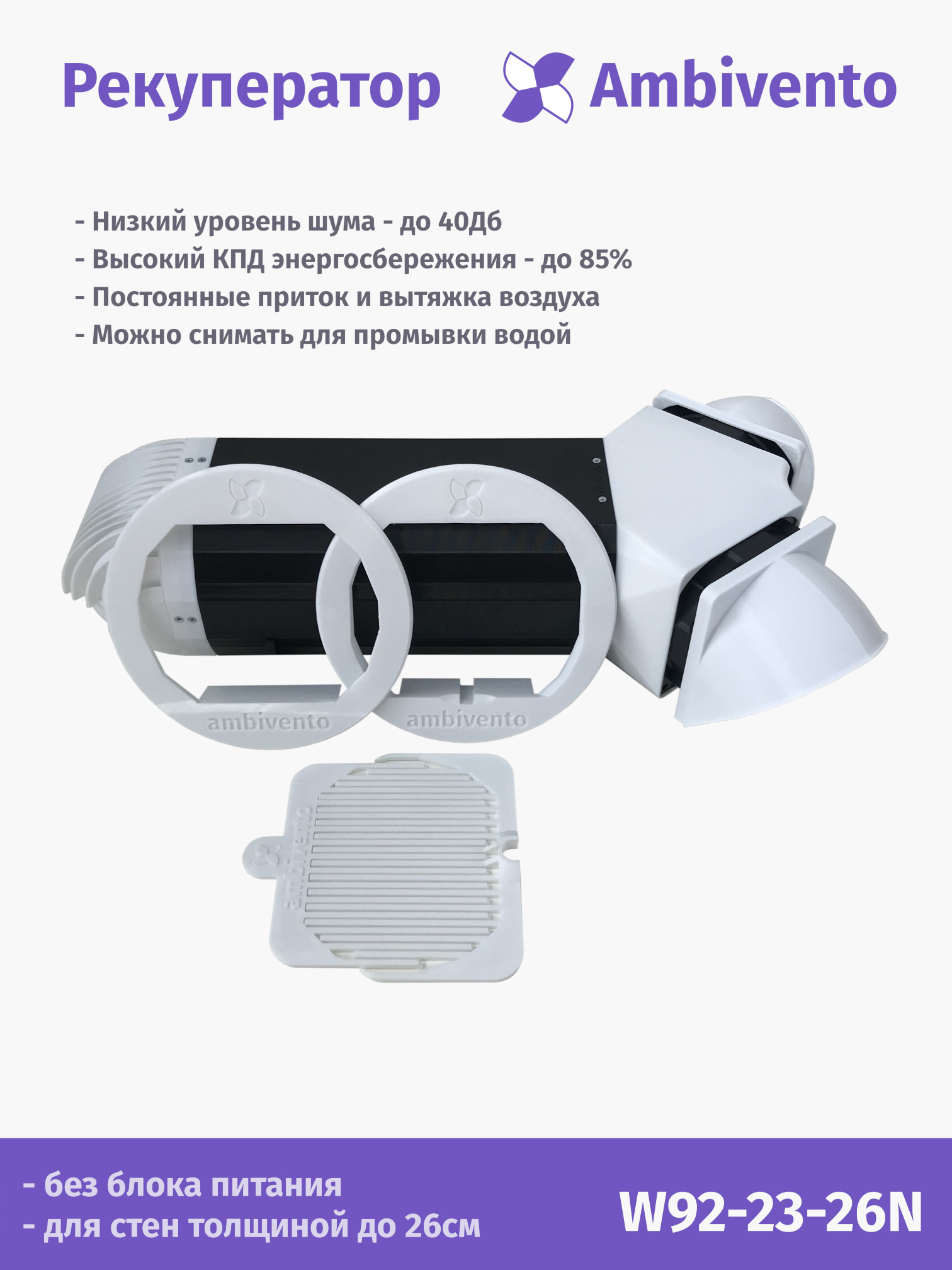 Благодаря уникальной запатентованной конструкции, в которой источники шума - вентиляторы расположены на улице, рекуператор Ambivento работает очень тихо. Даже на максимальной мощности работы, в помещение проникает шум на уровне 40 Дб в непосредственной близости и 35 Дб на расстоянии 2 метров, что позволяет комфортно использовать данную модель рекуператора круглые сутки даже в спальне.