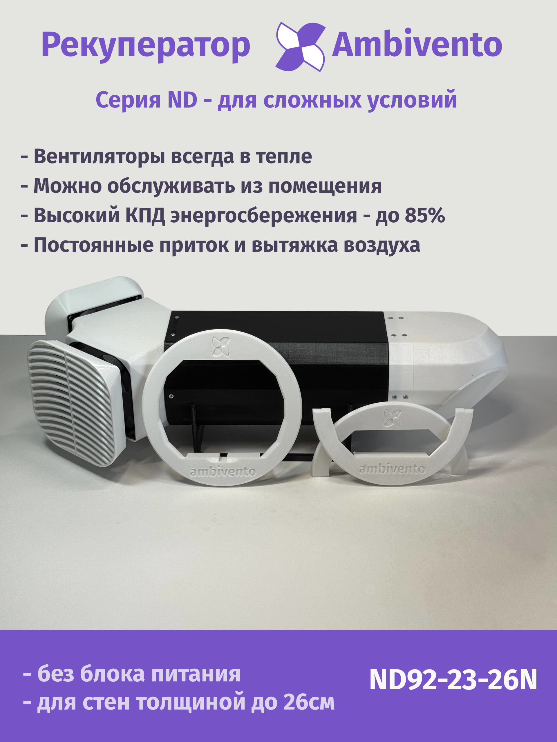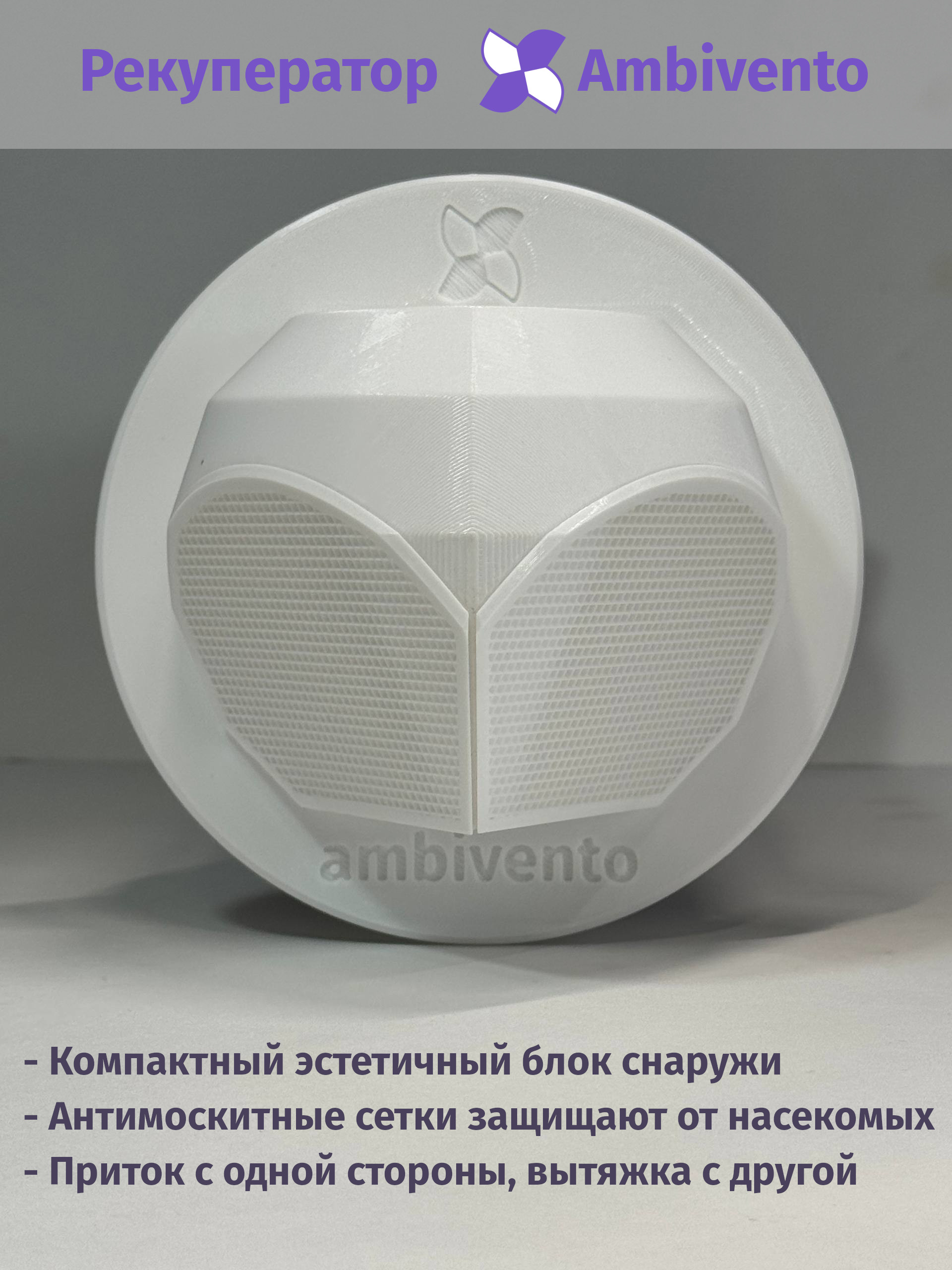 В рекуператоре Ambivento реализована непрерывная подача свежего воздуха в помещение. При этом отработанный воздух, при удалении на улицу, отдает бОльшую часть тепла поступающему свежему.