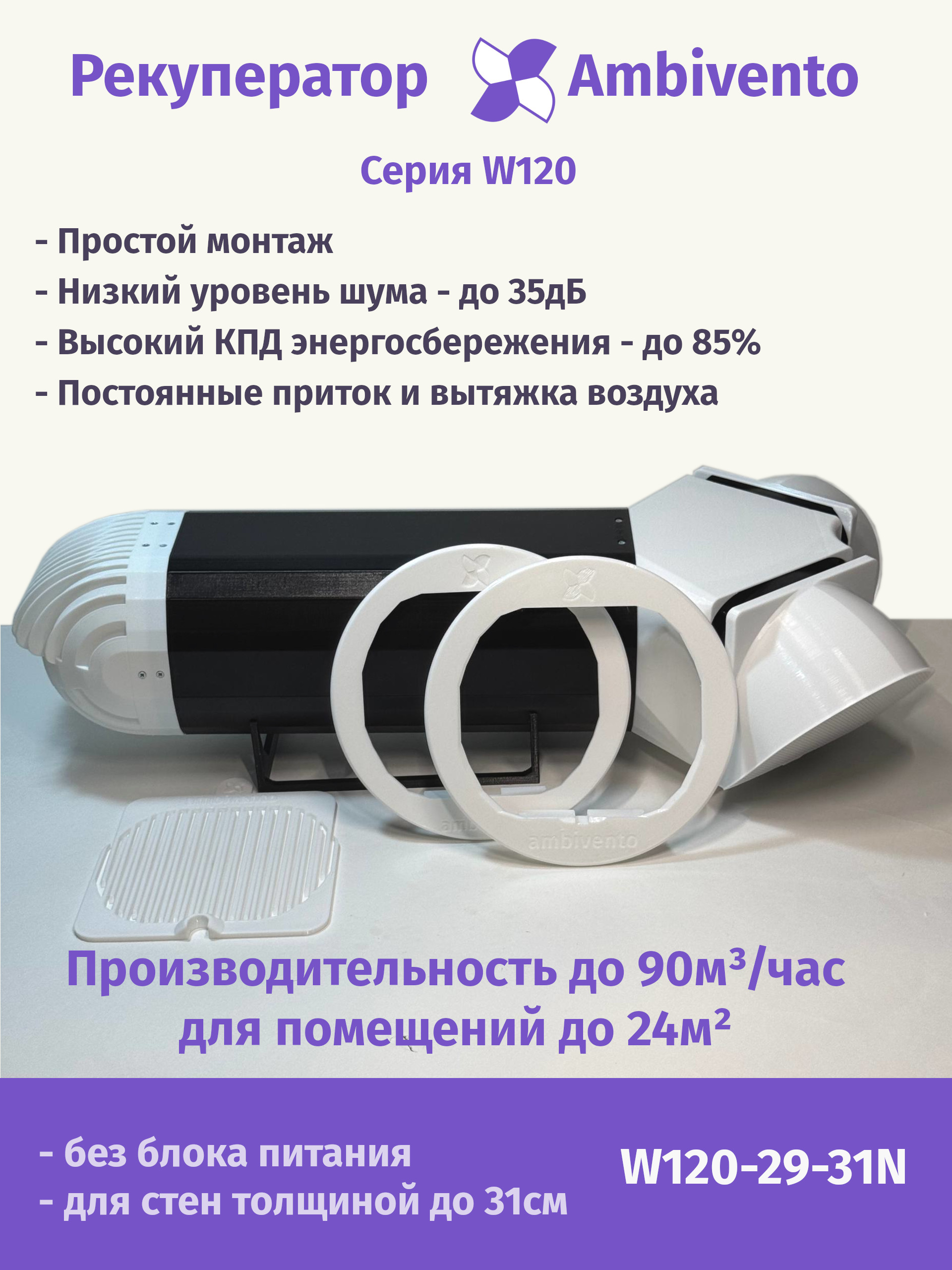 Благодаря уникальной запатентованной конструкции, в которой источники шума - вентиляторы расположены на улице, рекуператор Ambivento работает очень тихо. Даже на максимальной мощности работы, в помещение проникает шум на уровне 35 Дб в непосредственной близости и 30 Дб на расстоянии 2 метров, что позволяет комфортно использовать данную модель рекуператора круглые сутки даже в спальне.